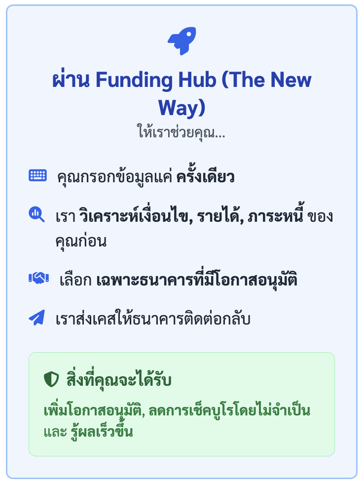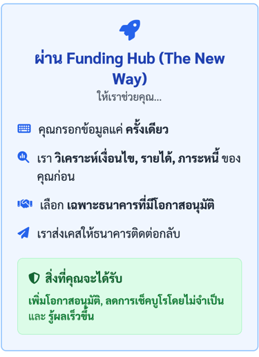 ก่อนใช้ Funding Hub ผมยื่นกู้เองมาสองธนาคารแล้วไม่ผ่าน เพราะภาระผ่อนเดิมค่อนข้างเยอะ ทีมงานช่วยอธิบายโปรไฟล์เครดิตของผมแบบเข้าใจง่าย แล้วเลือกธนาคารให้เหมาะกับเคสจริง ๆ สุดท้ายได้วงเงินสูงกว่าที่ตั้งใจไว้ และดอกเบี้ยดีกว่าที่เคยเสนอมาเองด้วย ที่สำคัญคือผมไม่ต้องเสียเวลาเดินเอกสารหลายที่เลย กรอกข้อมูลครั้งเดียวแล้วทีมงานจัดการต่อให้ทั้งหมด