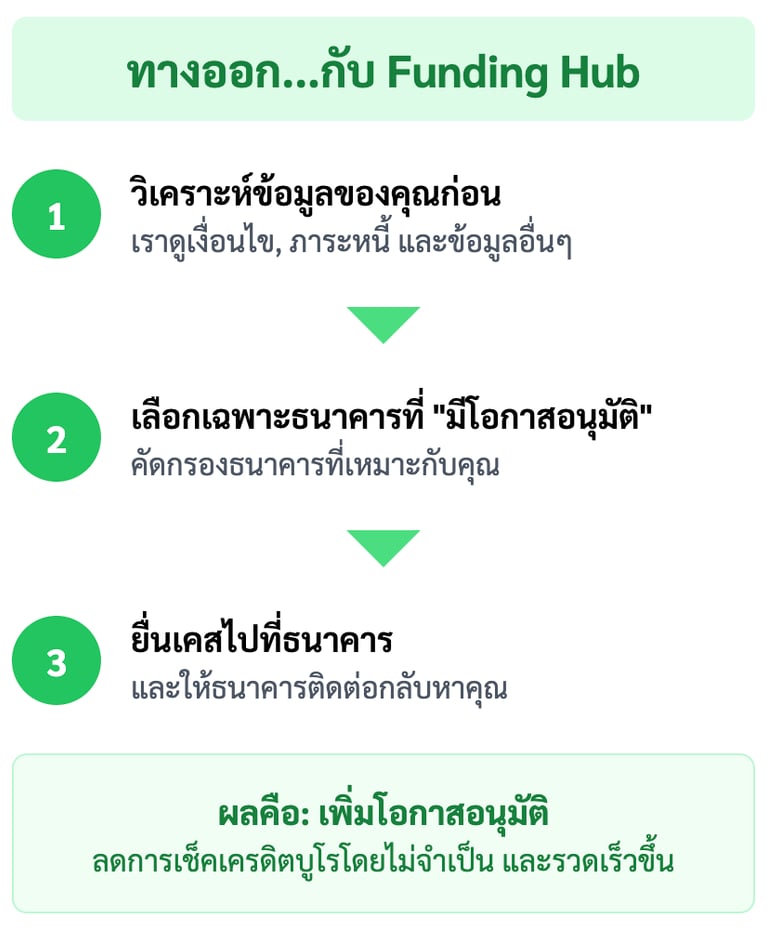 เราเป็นฟรีแลนซ์ ไม่มีสลิปเงินเดือน เลยไม่มั่นใจว่าจะกู้ผ่านไหม Funding Hub ให้เราอัปโหลดข้อมูลรายได้จริงจากงานและ statement แล้วทีมงานช่วยดูภาพรวมทั้งหมด ก่อนจะเลือกธนาคารที่เข้าใจรูปแบบรายได้แบบฟรีแลนซ์ของเราเป็นพิเศษ เขาส่งเคสตรงไปที่ธนาคารนั้นเลย ทำให้เคสเราไม่โดนปัดทิ้งตั้งแต่ด่านแรก และสุดท้ายก็อนุมัติวงเงินตามที่ต้องการ